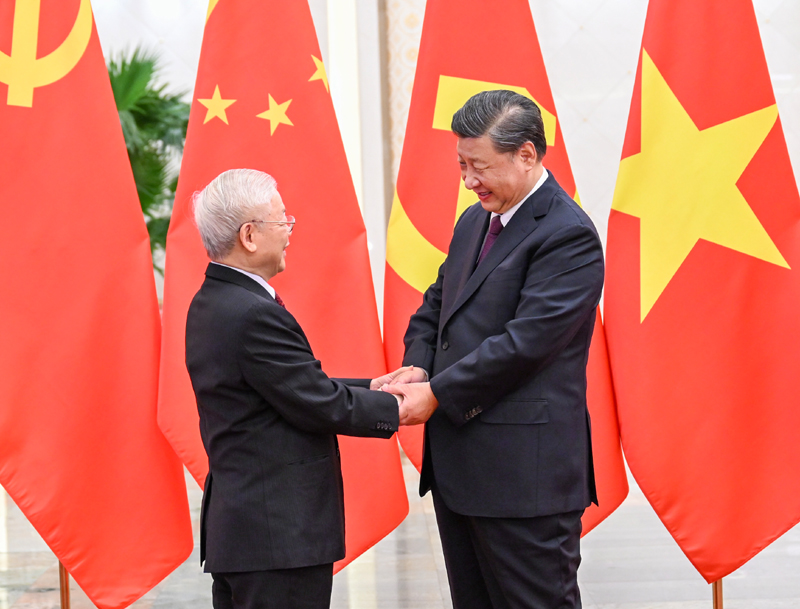 10月31日,中共中央总书记、国家主席习近平在北京人民大会堂同越共中央总书记阮富仲举行会谈。双方一致表示,要秉持“十六字”方针和“四好”精神,巩固传统友谊、加强战略沟通、增进政治互信、妥善管控分歧,推动新时代中越全面战略合作伙伴关系不断迈上新台阶。